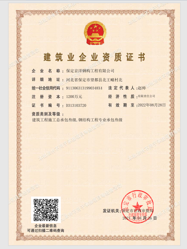 公司主要致力于鋼結構設計、制作、安裝、銷售為一體的鋼結構施工專業(yè)企業(yè)。成立于2010年,注冊資金1200萬元。公司擁有國內(nèi)先進的數(shù)控自動焊接設備、H鋼結構生產(chǎn)線、CZ鋼快速切換一體機、自動剪切壓板機等,優(yōu)良的制作加工車間及檢測設備。公司秉承“質(zhì)量求生存,管理出效益”發(fā)展理念,組建了一支高素質(zhì)、高水平的團隊以及責任明確、職責清楚、獎罰分明的管理體系。